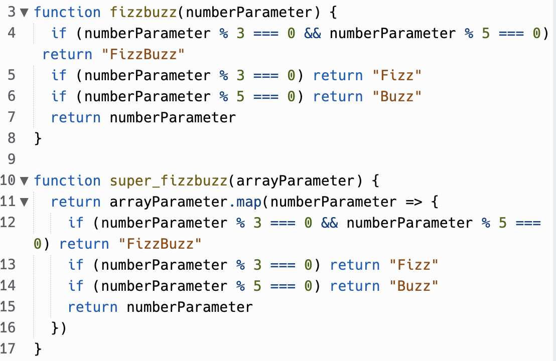 When I was thinking of what to write for this blog, I remembered the solution I had given. I thought at the time that I was very smart for realising the super_fizzbuzz function could be completed by copying the logic I had used for the fizzbuzz function.