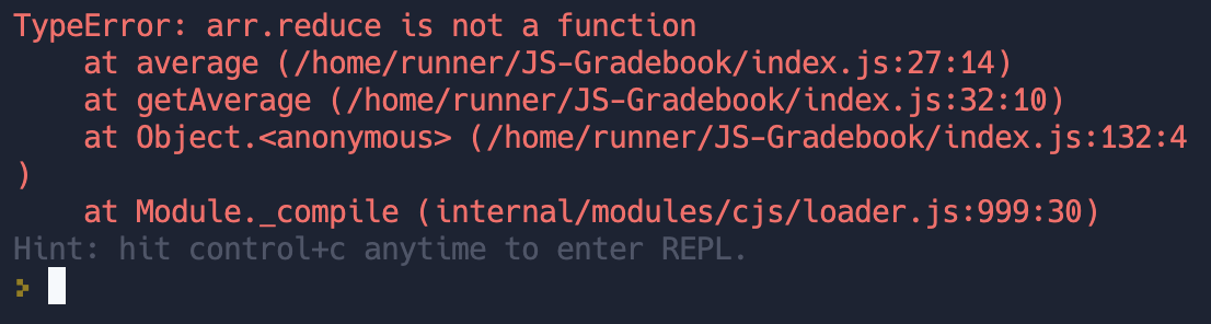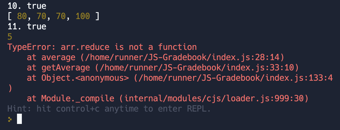 I ran into a bit of a block while doing the JS-Gradebook problem. Everything was going fine for a while, until I got near the end of the problem and came up with an error.